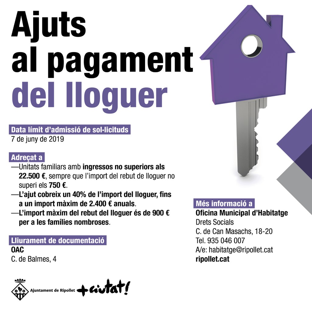 Més informació a l'Oficina municipal d'Habitatge (c. de Can Masachs, 18-20, telèfon 935046007) o per correu electrònic a habitatge@ripollet.cat.