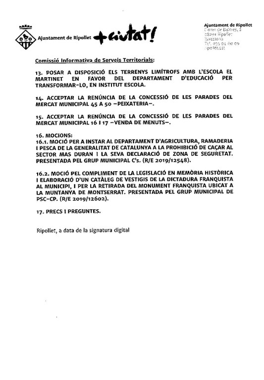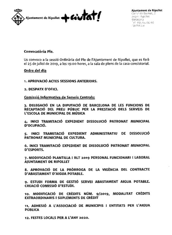 Més tard es votarà la modificació de crèdits número 9/2019, amb la modalitat de crèdits extraordinaris i suplements de crèdit, i l'adhesió de l'Ajuntament a l'associació de municipis i entitats per l'aigua pública. Tot seguit, el punt número 12 tractarà de les Festes Locals per a l'any 2020.