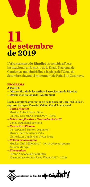 Un any més Ripollet celebrarà l'acte institucional amb motiu de la Diada Nacional de Catalunya, que tindrà lloc aquest dimecres a la plaça de l'Onze de Setembre, davant el monument de Rafael Casanova.