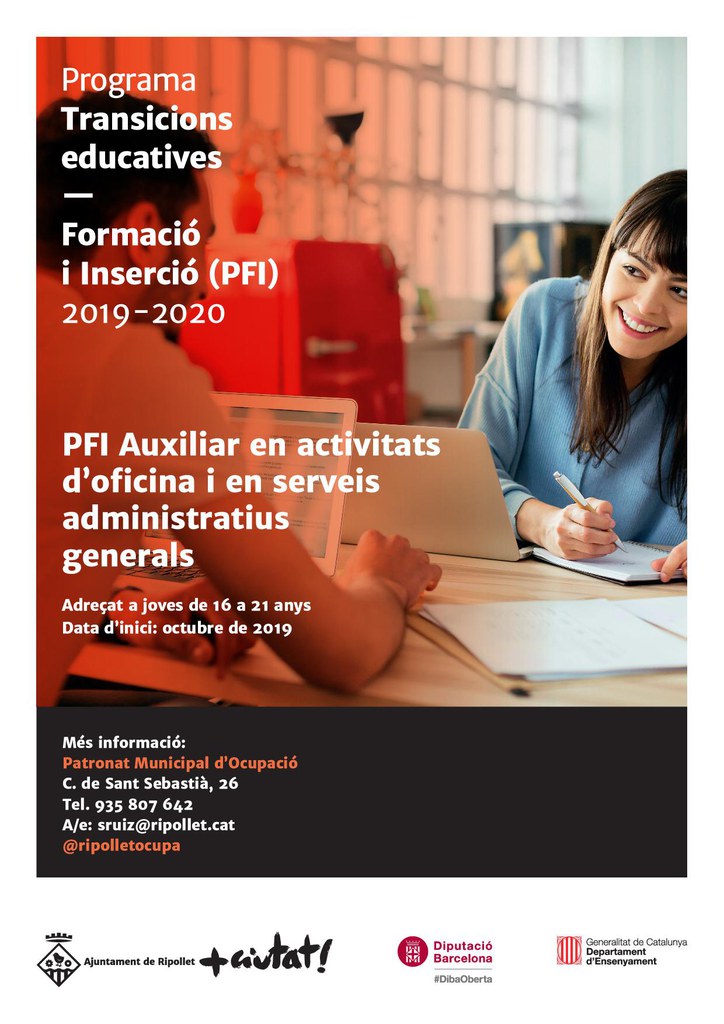 El Patronat Municipal d'Ocupació (PMO) iniciarà, la primera setmana d'octubre, dos programes de Formació i Inserció (PFI). Es tracta dels PFI Auxiliar Imatge Personal: perruqueria i estètica i Auxiliar en activitats d'oficina i en serveis administratius generals. Els programes estan adreçats a joves de 16 a 21 anys, que no hagin obtingut el títol d'ESO.