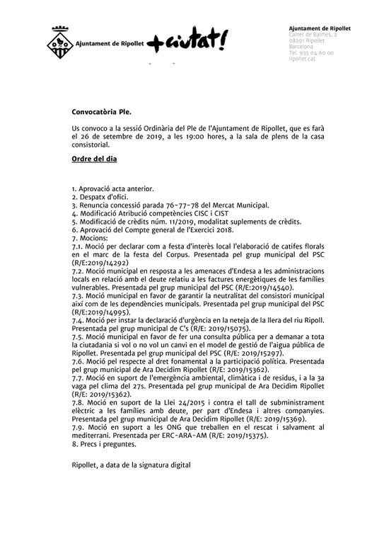 Aquest dijous, 26 de setembre, a les 19 h, tindrà lloc una sessió plenària de caràcter ordinari, que compta amb 8 punts a l'ordre del dia, els quals poden consultar a la imatge de la convocatòria. El setè punt compta amb 9 mocions presentades a debat pels diferents grups municipals. Quatre són del PSC (per declarar les catifes de Corpus festa d'interès local, de resposta a les amenaces d'Endesa, per garantir la neutralitat política dels equipaments municipals pel que fa a la simbologia relacionada amb el debat independentista i per sol·licitar una consulta pública per decidir sobre la municipalització de l'aigua), una de Ciutadans (per declarar d'urgència la neteja del riu Ripoll), tres d'Ara Decidim Ripollet (pel respecte al dret fonamental de la participació política, en suport de l'emergència ambiental i de la 3a vaga pel clima del 27S i contra el tall de subministrament elèctric a les famílies en deute) i una d'ERC (en suport a les ONG que treballen en el rescat al Mediterrani).
