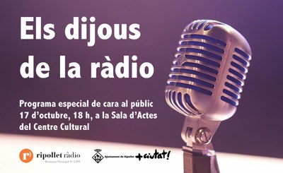 Aquest dijous, 17 d'octubre, Ripollet Ràdio ha organitzat el primer dels programes especials que, com a novetat, l'emissora municipal posa en marxa aquesta temporada. Es tracta d'Els dijous de la ràdio, un magazín informatiu que es realitzarà cada tercer dijous de mes, de 18 a 20 hores, de cara al públic i amb micro obert als assistents.