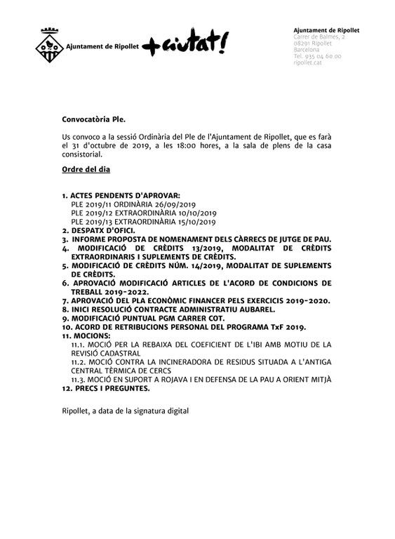 Les persones interessades poden assistir al Ple o seguir-lo en directe a través de Ripollet Ràdio (91.3 FM), ripolletradio.cat i el canal de Youtube Ripollet TV.