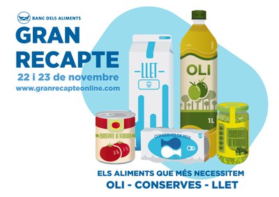 El divendres 22 i el dissabte 23 de novembre són els dies del gran recapte d'aliments, que s'ha marcat l'objectiu aquest any d'arribar als deu mil quilos. Es necessiten especialment oli, llet i conserves de peix i carn. Dels deu mil quilos esperats, vuit mil es destinarien a Càritas Ripollet i dos mil a Centre Reto Ripollet. L'excedent, si n'hi ha, es destinarà al Banc dels Aliments. Tot i que aquest any hi ha menys voluntaris que l'any passat està garantida la seva presència als principals punts de recollida de la vila.