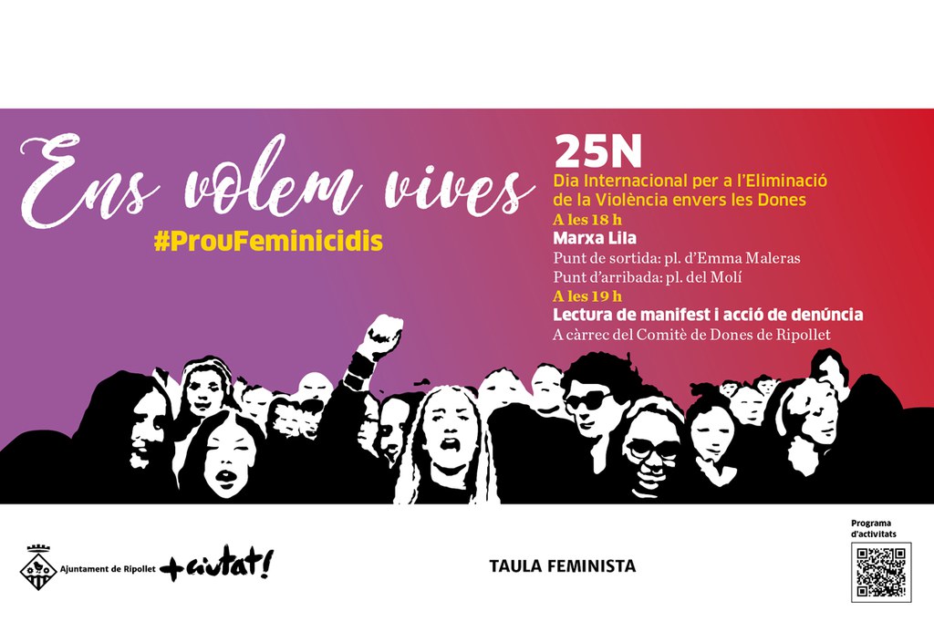 Aquest 25 de novembre Ripollet commemora el Dia mundial per l'eliminació de la violència envers les dones. L'acte principal del dia i del programa d'actes del 25N serà la Marxa Lila, que sortirà de la plaça d'Emma Maleras, al Pont Vell, a les sis de la tarda. A les set està previst que aquesta manifestació arribi a la plaça del Molí, epicentre del moviment feminista ripolletenc. Allà es llegirà el comunicat institucional, i el Comitè de dones realitzarà un acte de denúncia cap a la violència masclista.