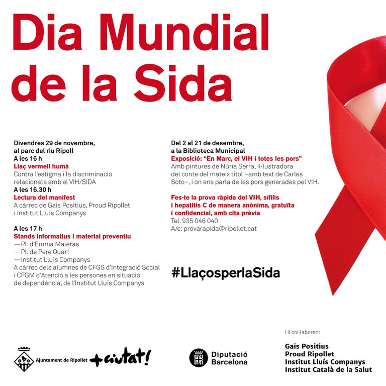 Divendres, 29 de novembre, els actes començaran a les 16 h, amb un llaç humà vermell contra l'estigma i la discriminació relacionades amb el VIH/SIDA. L'objectiu és fer una foto que es comparteixi a les xarxes socials, en el marc de la iniciativa #LlaçosperlaSida. Tot seguit es llegirà el manifest a càrrec de Gais Positius, Proud Ripollet i alumnes de l'Institut Lluís Companys. A partir de les 17 h, a les places d'Emma Maleras i Pere Quart i al mateix institut, els alumnes dels Cicles Formatius d'Integració social i Atenció a les persones en situació de dependència de l'Institut Lluís Companys instal·laran estands informatius on també repartiran material preventiu. Aquest dijous, les llevadores del servei d'atenció a la salut sexual i reproductiva (ASSIR) del CAP II realitzaran diversos tallers amb grups d'alumnes del centre, per tal que aquesta formació els sigui útil i la puguin retornar en forma de taller comunitari, amb la instal·lació dels estands informatius de divendres.