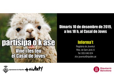 La primera sessió va adreçada a les persones joves en general i es realitzarà el dimarts, 10 de desembre, a les 18 h, al Casal de joves. La segona va adreçada a entitats juvenils i es realitzarà el dimecres, 11 de desembre, a les 18 h, al Casal de Joves.