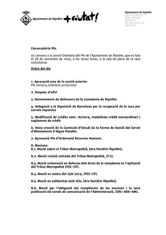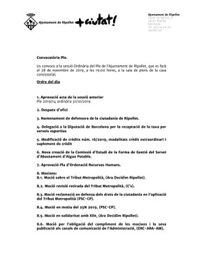 Aquest dijous, 28 de novembre, a les 19 h, tindrà lloc una sessió plenària de caràcter ordinari, que compta amb 9 punts a l'ordre del dia. Entre ells hi ha el nomenament de la Defensora de la ciutadania de Ripollet, Nuria Blasco Yuste, i la creació de la nova Comissió d'estudi de la forma de gestió del servei d'abastament d'aigua potable. A més d'aquests punts, l'aprovació de l'acta anterior i el despatx d'ofici, es debatran la delegació a la Diputació de Barcelona per la recaptació de la taxa per serveis esportius, una modificació de crèdits, i l'aprovació del Pla d'Ordenació de Recursos Humans.