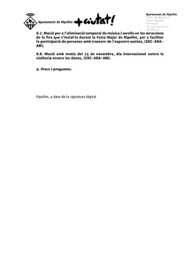 El punt de mocions compta amb 8 propostes, tres de les quals fan referència al Tribut Metropolità, presentades pels grups Ara Decidim Ripollet, C's i PSC-CP. N'hi ha dues en suport al 25N (d'ERC i el PSC), una en solidaritat amb Xile (de Decidim), una altra per l'obligació del compliment de les mocions (presentada per ERC) i una darrera per a l'eliminació temporal de música i sorolls a la fira per facilitar la participació de les persones amb transtorn de l'espectre autista.
