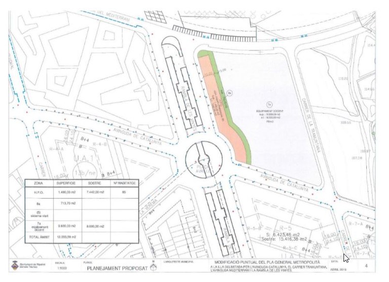 L'edifici, amb 85 habitatges públics i una escola d'adults, es construirà a l'illa delimitada per la Rambla de les Vinyes, l'Avinguda del Mediterrani, el carrer Tramuntana i l'Avinguda de Catalunya. L'objectiu del projecte és seguir la tendència arquitectònica d'un model de ciutat compacta amb hibridació d'usos i construcció sostenible. En aquest sentit, l'alcalde ha explicat que "volem un equipament que no sigui tancat en sí mateix, sinó que tingui interrelació amb la resta d'edificis i carrers". A més, en la línia de les accions de l'Any Sumem Verd, es tindran en compte les solucions arquitectòniques relatives a sostenibilitat ambiental i eficiència energètica.