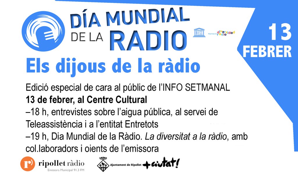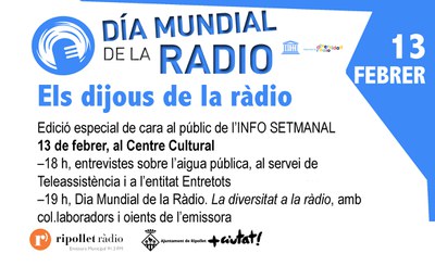 Aquest 13 de febrer és el Dia Mundial de la Ràdio. Coincidint amb aquesta commemoració, l'emissora municipal ofereix avui una nova edició especial de l'Info Setmanal, "Els dijous de la ràdio", de les 6 a les 8 de la tarda, de cara al públic des de la Sala d'Actes del Centre Cultural. La primera hora comptarà amb entrevistes d'actualitat sobre l'aigua pública, al servei de Teleassistència i a l'entitat Entretots. A partir de les 7, tractarà sobre "La diversitat a la ràdio", lema de l'ONU per al Dia Mundial de la Ràdio 2020, amb els col·laboradors de l'emissora i micro obert al públic.