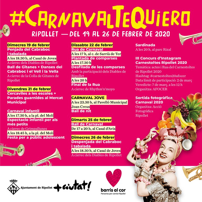 La penjada del Cabraboc, aques dimecres, a les 18.30 hores, al balcó de Cal Teixell, a la rambla de Sant Jordi, 6, obre la celebració del Carnaval a Ripollet. L'acte estarà amenitzat amb la tradicional tabalada a càrrec de Diables de Ripollet i els balls de Gitanes i danses del Cabraboc i la llegenda del Vell i la Vella. Fins al Dimecres de Cendra, Ripollet viurà 8 dies de Carnaval a tot ritme, que, sota el lema #CarnavalTeQuiero, oferirà un variat programa d'actes que busca la participació de tots els públics i entitats de la ciutat. Carmen Miranda, la famosa actriu i cantant de samba, que va portar la cultura brasilera arreu del món durant els anys 40, és la imatge del Carnaval local d'enguany.