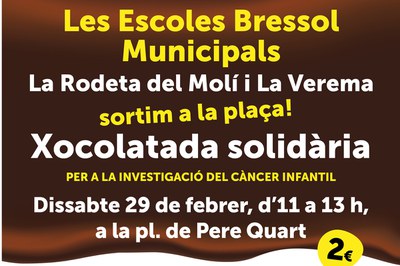 Les Escoles Bressol Municipals La Rodeta del Molí i La Verema, amb el suport de les seves respectives Associacions de Mares i Pares d'Alumnes, volen sortir al carrer i apropar a la ciutadania el seu projecte educatiu. Per fer-ho, el pròxim dissabte, 29 de febrer, d'11 a 13 h, han organitzat una jornada festiva, amb diferents espais, tallers i jocs, que inclourà una xocolatada solidària per a la investigació del càncer infantil.