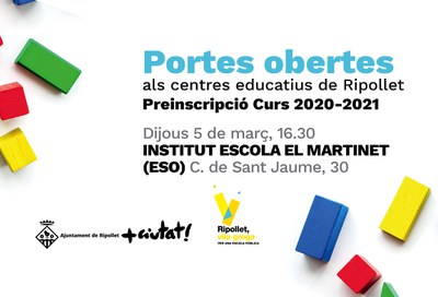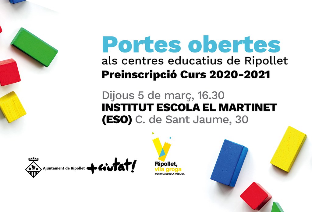 Aquest dijous comencen les Jornades de portes obertes amb la visita a ESO de l'institut escola El Martinet. L'hora de recepció de les famílies és a les 16.30 hores. La setmana vinent serà el torn de l'institut Lluís Companys, de les escoles Tiana de la Riba, Enric Tatché, Gassó i Vidal i la primària d'El Martinet. Cada jornada publicarem informació dels centres que facin portes obertes. Trobareu més info a la secció de Preinscripció, relacionada a sota.