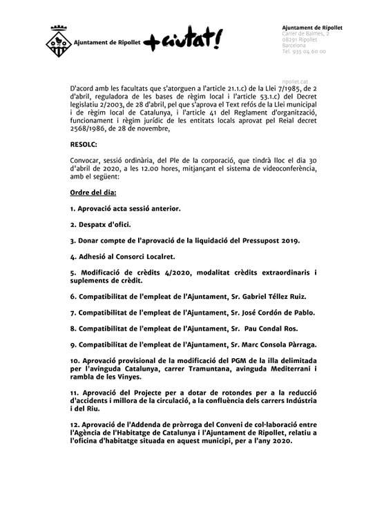 Aquest dijous, 30 d'abril, se celebra el Ple ordinari mensual. En aquesta ocasió, tindrà lloc a les 12 del migdia i serà mitjançant el sistema de videoconferència, en compliment de les mesures de prevenció del coronavirus. El Ple compta amb 15 punts a l'ordre del dia, entre ells el de l'aprovació de la liquidació del Pressupost 2019, l'aprovació de la modificació del PGM dels terrenys de la rambla de les Vinyes -on s'han de construir 85 pisos de protecció oficial i la nova escola d'adults-, les noves rotondes del carrer d'Indústria i del riu, convenis de promoció de l'habitatge social i de lloguer i l'adhesió al Consorci Localret, entre altres.