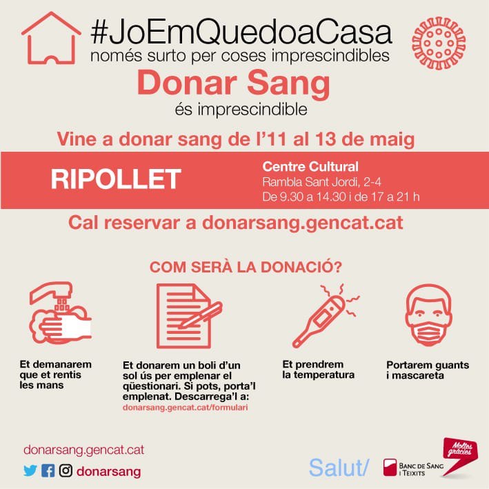 Després de la bona acollida del passat mes d'abril, quan es van registrar 170 participants, entre ells 20 nous donants, amb un total de 150 donacions i 20 oferiments, el Banc de Sang i Teixits torna els dies 11, 12 i 13 de maig, al Centre Cultural de Ripollet. L'horari d'atenció serà de 9.30 a 14.30 h i de 17 a 21 h. Només s'atendran les cites concertades. Cal reservar a donarsang.gencat.cat/apuntat