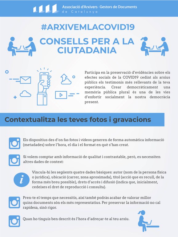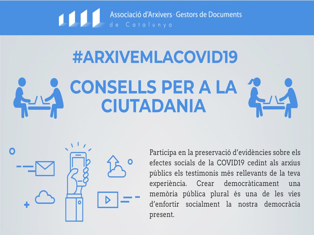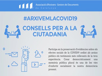 L'Arxiu Municipal de Ripollet s'ha sumat a la campanya #ArxivemlaCOVID19, promoguda per l'Associació d'Arxivers - Gestors de Documents de Catalunya arreu del país, per poder conservar i documentar el moment històric que estem vivint, provocat per la COVID19. És per això que es demana a la ciutadania que no llenci o esborri aquells dibuixos, cartes, pancartes o qualsevol altre document textual o gràfic, així com fotos o vídeos enregistrats amb motiu d'aquesta pandèmia, per tal de cedir-los a l'Arxiu Municipal.