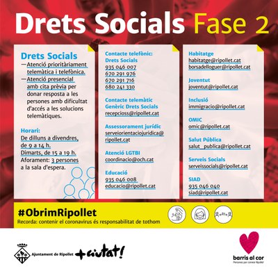 A banda de les novetats anunciades per l'Estat respecte a la mobilitat, la reunió amb familiars i amics i l'accés a bars i restaurants, a Ripollet, l'Ajuntament continua actualitzant i seguint el Pla de Restabliment de Serveis, que tot i l'obertura, segueix prioritzant l'accés als serveis municipals i l'atenció ciutadana de forma telefònica i telemàtica i apel·lant a la responsabilitat de la ciutadania. Amb l'etiqueta #ObrimRipollet, el consistori anirà informant novament de les noves mesures de la fase 2 de desescalada a les xarxes socials i a la web municipal ripollet.cat (consulteu imatges adjuntes).