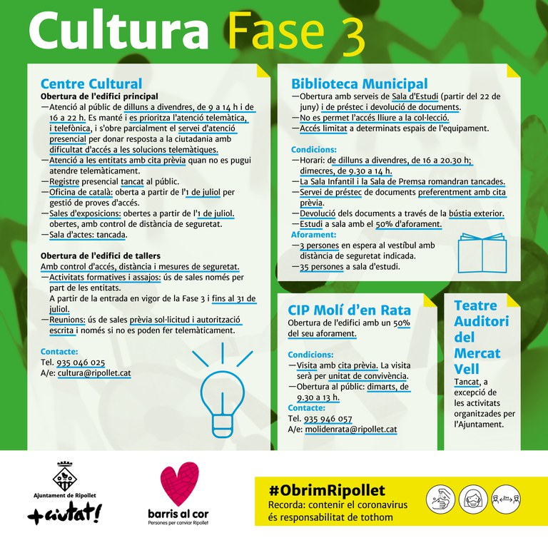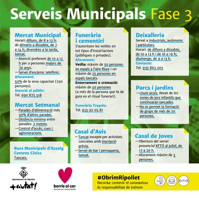 A banda de les novetats anunciades per l'Estat, entre les que destaca la llibertat de moviment dins la regió, l'eliminació de franges horàries i les reunions de fins a 20 persones, a Ripollet, l'Ajuntament ha continuat avançant i actualitzant el Pla de Restabliment de Serveis, que segueix prioritzant l'accés als serveis municipals i l'atenció ciutadana de forma telefònica i telemàtica i apel·lant a la responsabilitat de la ciutadania. Amb l'etiqueta #ObrimRipollet, el consistori torna a informar de les noves mesures de la fase 3 de desescalada a les xarxes socials i a la web municipal ripollet.cat (consulteu imatges adjuntes).