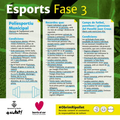 Podeu consultar el que s'hi pot fer a la fase 3, al web de la Generalitat de Catalunya. Recordem que l'ús de mascaretes continua essent obligatori, sempre que no es pugui mantenir la distància de seguretat de 2 metres, a la via pública, en espais a l'aire lliure (parcs, per exemple) i en espais tancats d'ús públic o que estiguin oberts al públic (botigues, per exemple). No és obligatòria en menors de 6 anys, persones amb dificultats respiratòries, persones amb discapacitat o depenents, en activitats incompatibles com menjar o beure i per causa de força major o situació de necessitat.