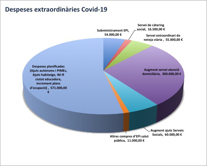 A aquesta minoració d'ingressos inicial, s'han de sumar les despeses que no estaven previstes per efectes de la Covid-19 i que s'ha anat donant compte al Ple, amb compres per emergència i modificacions de crèdits. Es tracta de la compra de material d'EPI, tant per al personal de l'Ajuntament com d'empreses que donen servei a l'Ajuntament; el servei de càtering; l'ampliació del contracte de neteja viària per a la desinfecció i neteja extra; l'ampliació del contracte del Servei d'Atenció Domiciliària i les partides d'ajuts (menjador, autònoms i Pimes, habitatge, ocupació...). En total, una despesa associada a la Covid-19 per un total d'1.067.500 €.