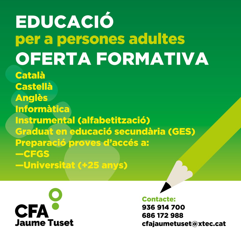 El curs 2020-2021 està a punt de començar també al CFA Jaume Tuset, l'Escola d'Adults de Ripollet, que arriba als seus últims dies de matrícula. Fins el dimecres, 9 de setembre, les persones que van fer la preinscripció al juny han de fer la matrícula, trucant al 936914700 per confirmar la plaça. Les persones que no van fer la preinscripció han de demanar cita prèvia.