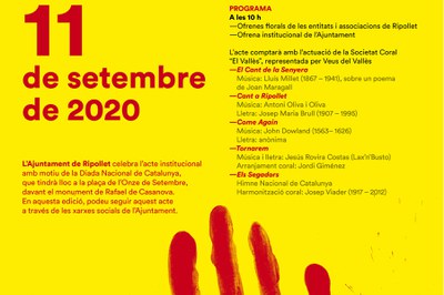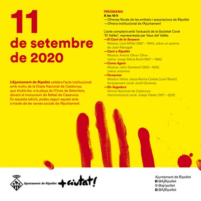 L'acte institucional de la Diada Nacional de Catalunya a Ripollet tindrà lloc aquest divendres, a les 10 hores, a la plaça de l'Onze de setembre, davant el monument a Rafael Casanova. De manera excepcional, tindrà l'aforament reduït, limitat als representats que facin les ofrenes florals, segons les mesures de prevenció de la COVI-19. Tampoc hi haurà parlaments ni les tradicionals actuacions d'entitats. Més d'una desena d'entitats han confirmat la seva participació. L'acte estarà amenitzat per la Coral Veus del Vallès de la Societat Coral "El Vallès", que actuarà també segons el protocol sanitari previst. A causa de la situació extraordinària i la impossibilitat de donar acte accés lliure al públic, la diada es podrà seguir en directe a través de del canal de Facebook de l'Ajuntament de Ripollet. Anteriorment, a les 9, el grup municipal d'Esquerra Republicana i el Jovent Republicà faran la seva pròpia ofrena.