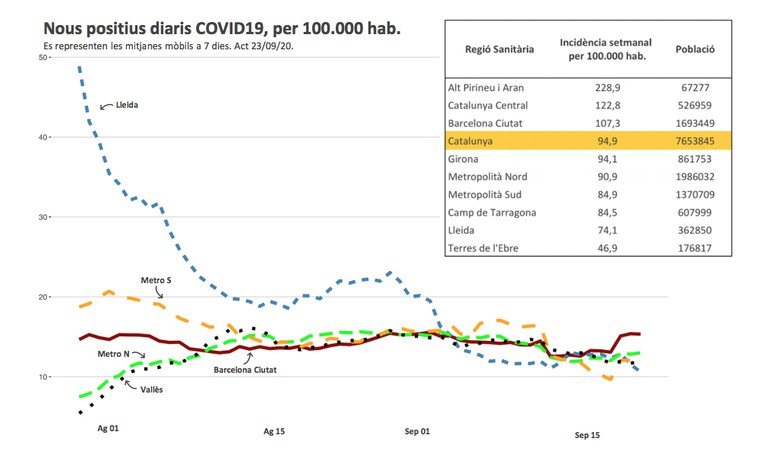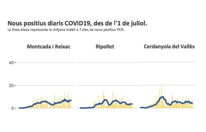 Segons l'informe de l'Agència de Salut Pública de Catalunya, la darrera setmana s'han detectat a Ripollet un total de 26 casos positius, amb una incidència setmanal per cada 100.000 habitants de 67,2 i un risc de rebrot de 140,1. En general, les dades fins al 24 de setembre indiquen que la corba temporal epidèmica de casos de COVID-19 al Vallès occidental, on s'han passat del 883 als 719 casos positius en la darrera setmana, sembla aplanar-se. La dada preocupant és que el nombre de persones ingressades per COVID-19 al Vallès ha augmentat considerablement durant el setembre. A data 23 de setembre hi ha 195 persones hospitalitzades al Vallès per COVID-19, 21 d'elles a la UCI.