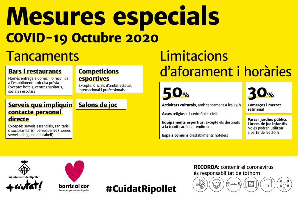Aquest divendres a la mitjanit, amb la publicació en el Diari Oficial de la Generalitat de Catalunya (DOGC) de la resolució SLT/2546/2020, de 15 d'octubre, han entrat en vigor les noves mesures en matèria de salut pública per a la contenció del brot epidèmic de la pandèmia de COVID-19 al territori de Catalunya.