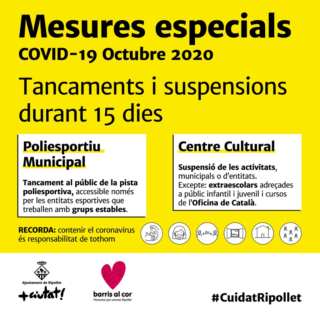 L'Ajuntament de Ripollet ha anunciat les afectacions als equipaments municipals de Cultura i Esports, amb motiu de les noves restriccions decretades per la Generalitat de Catalunya per tal de combatre la propagació de la COVID-19, i que s'afegeixen a les que van entrar en vigor ja la setmana passada. S'ha decidit, doncs, la suspensió temporal, durant 15 dies, de les activitats cíviques, comunitàries, presencials i de caràcter grupal en equipaments cívics. Així, s'han suspés tant les activitats presencials desenvolupades per les entitats com les organitzades per l'Ajuntament a les instal·lacions del Centre Cultural, que, en alguns casos, podrien reorganitzar-se de manera telemàtica. Pel que fa al Poliesportiu Municipal, es tanca al públic general la pista poliesportiva, que quedarà disponible només per a les entitats esportives que treballen amb grups estables.
