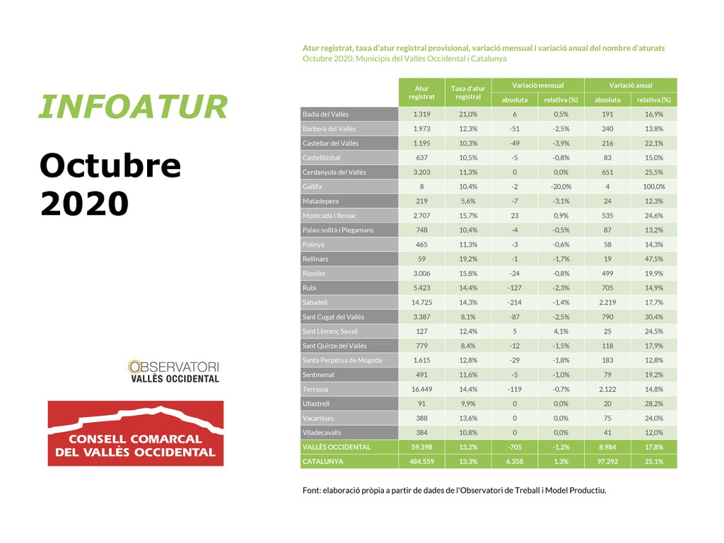 Pel que fa a la taxa interanual, nota de ple la crisi econòmica provocada per la COVID-19 i és d'un 19,9% a la vila, amb 499 aturats més que l'octubre de l'any passat. Aquesta taxa interanual és lleugerament més alta que la mitjana del Vallès Occidental (17,8%) però molt inferior a la mitjana de Catalunya, que arriba al 25,1%.