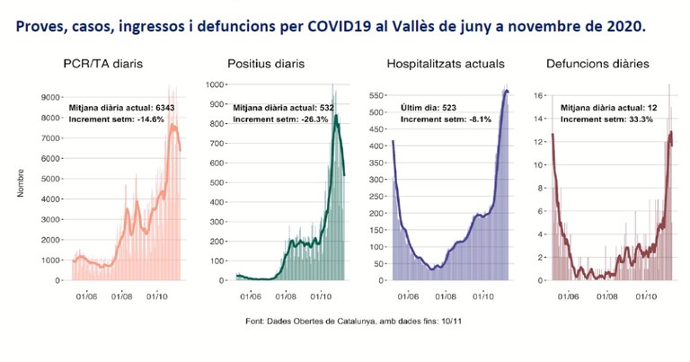 La incidència de casos de COVID-19 al Vallès està disminuint després del gran augment del mes d'octubre. També s'han realitzat un 15% menys de proves i tot i que la positivitat està disminuint, encara és d'un 10% de mitjana. El total d'ingressos hospitalaris del 2 al 8 de novembre ha disminuït fins a 327, dels 405 la setmana anterior, però no el nombre d'ingressos a l'UCI (53) ni les defuncions, que han estat 84, una trentena més que la setmana anterior.