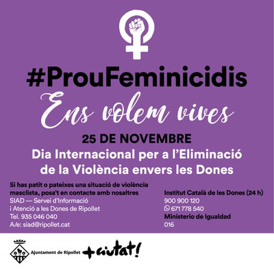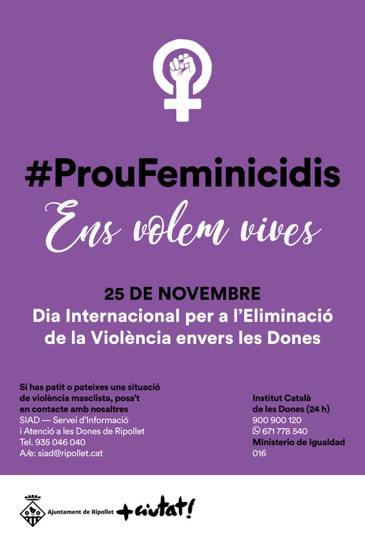 Des del Servei d'Informació i Atenció a les Dones de Ripollet, el SIAD, de gener a setembre de 2020 s'han realitzat un total de 1.218 actuacions, la majoria d'acollida i atenció psicològica i 33 d'atenció jurídica. De mitjana, s'han obert 54 expedients mensuals. Els casos, en més d'un 40% han arribat per iniciativa de les mateixes dones, mentre que prop d'un 29% han estat derivats de Serveis Socials, un 18,3% dels cossos de seguretat i un 8,1% dels serveis de Salut.