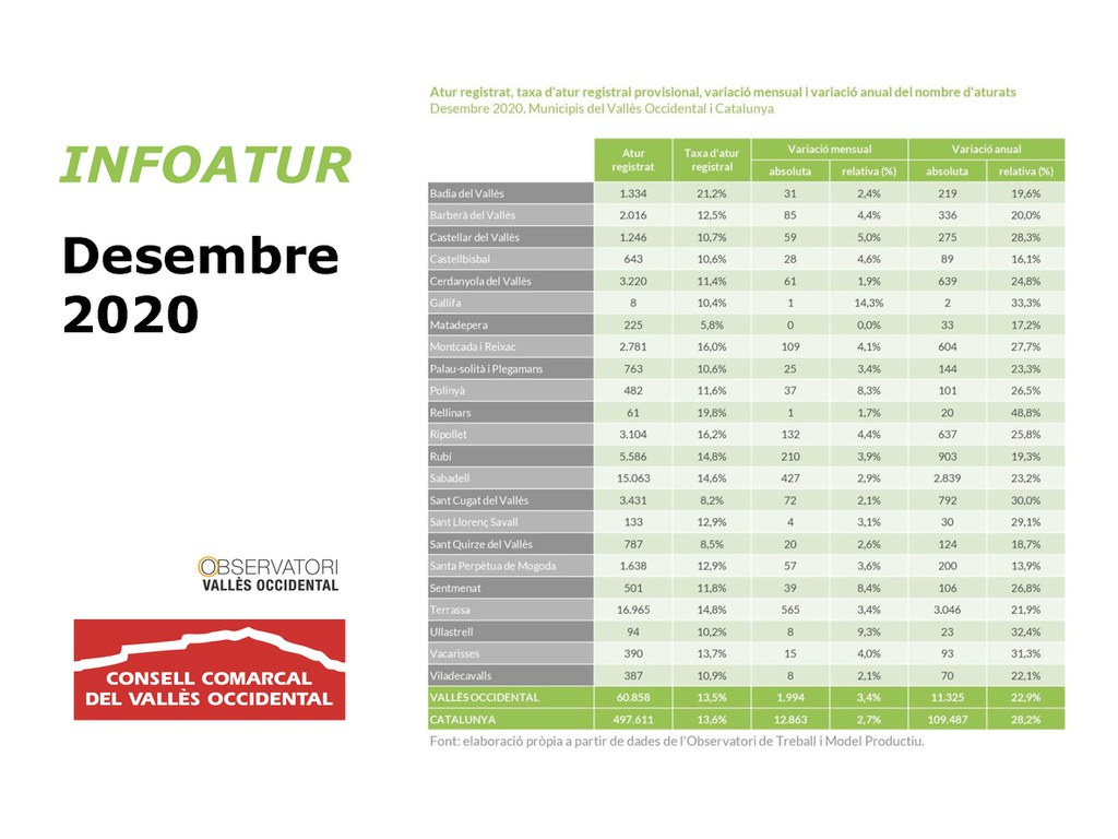 El mes de desembre va deixar un augment de l'atur a Ripollet de 132 persones, el que suposa un increment del 4,4% respecte novembre, i deixa la taxa d'aturats en un 16,2%, la tercera més alta de la comarca, només per darrera de Badia del Vallès i Rellinars. Aquesta pujada és superior a la de la mitjana comarcal, on augmenta un 3,4% i situa la taxa al 13,5%, i també superior a la catalana, que veu com els aturats creixen un 2,7% fins una taxa del 13,6%. L'atur també creix molt a Ripollet respecte desembre de 2019, degut a la crisi provocada per la COVID-19: la variació interanual és d'un 25,8%, 637 persones aturades més.