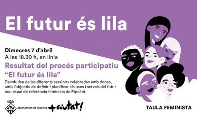 Aquest dimecres, dia 7, a les 18.30 h, es presenta el resultat del procés participatiu "El futur és lila", per definir els usos del nou espai de referència feminista a Ripollet, que s'ubicarà a les dependències de l'antic Jutjat de Pau, al carrer Nou número 21. El procés va constar d'unes enquestes al portal de participació del web de l'Ajuntament, a més de dues sessions obertes tant a ciutadania com a entitats.