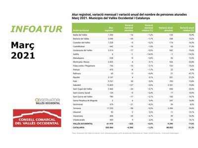 El passat mes de març va tancar amb quatre aturats més a Ripollet dels que hi havia al finalitzar el mes anterior, un lleuger augment d'un 0,1% en un mes de baixades generalitzades a tota la comarca i a Catalunya, segons dades del Consell Comarcal del Vallès Occidental. Ripollet és una de les poques poblacions de la comarca on augmenta aquest indicador, que a nivell comarcal es redueix en 325 persones (un decreixement del 0,5%) i a nivell català baixa en més de 6.000 persones (una reducció de l'1,3%).