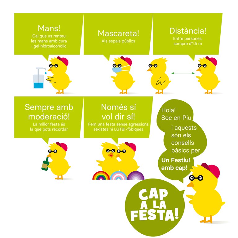 En paral·lel al Festiu!, l'Ajuntament ha preparat la campanya Cap a la Festa!, també presentada dilluns. Un decàleg de com viure les festes de manera normalitzada i segura. La intenció és que aquesta campanya acompanyi les activitats que es facin durant tot l'any a Ripollet. Per això s'ha creat el personatge del pollet Piu, que dóna consells bàsics per viure el Festiu amb cap.