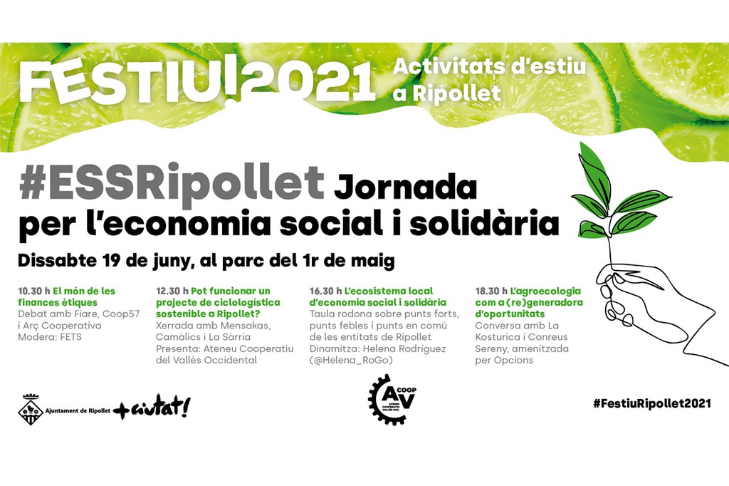 El pròxim dissabte, 19 de juny, el parc del 1r de maig acollirà una jornada per l'economia social i solidària, organitzada per l'Ajuntament de Ripollet, a través de l'àmbit de Desenvolupament Econòmic, amb la col·laboració de l'Ateneu Cooperatiu del Vallès Occidental. La jornada, que s'inclou a la programació del Festiu Ripollet, comptarà amb la participació d'una quinzena d'entitats del món del cooperativisme i l'ESS, per debatre i explicar les seves experiències en relació amb temes com les finances ètiques, la ciclologística sostenible, l'agroecologia o l'economia social i solidària a Ripollet.