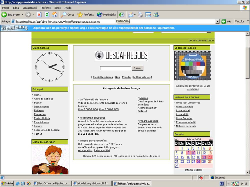 El passat dijous, la web de l’escola Gassó i Vidal va registrar la descàrrega número 10.000. Després d’un any i mig de la seva posada en marxa, el volum total de vídeos que es poden trobar a la web ocupa gairebé un gigabyte de memòria, i supera el centenar d’arxius. Pel que fa als vídeos més vistos, aquests són el concert de Nadal de l’any 2004 de la classe de parvulari dels peixos, amb 404 descàrregues, i el pregó del Rei Carnestoltes de l’any passat, a càrrec dels alumnes de la classe de quart, que ha estat descarregat 384 vegades. Els arxius de la inauguració del menjador del centre i de la dansa ‘La Castanyera’ pels alumnes de P-3, també han superat les 300 descàrregues.