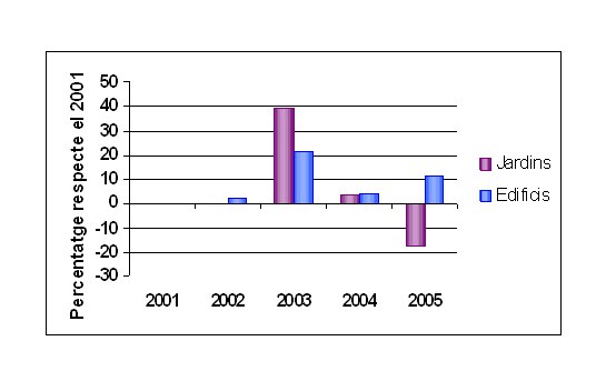 No va passar així amb els edificis municipals, on el consum va augmentar al voltant d’un 7%, tot i que cal tenir en compte els nous subministraments de la Llar d’Infants municipal i del CEIP El Martinet. Pel que fa a la resta d’anys, l’augment ha estat en una progressió raonable, en funció de l’augment tant de zones de rec com del nombre de dependències municipals. L’excepció va ser l’any 2003, en que tant les temperatures com la incorporació de set noves zones verdes van comportar que es disparés el consum d’aigua.