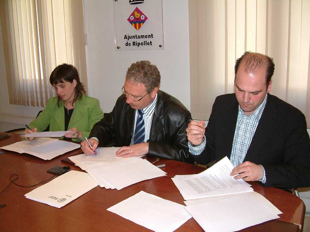 FOTO: Acte de signatura. D'esquerra a dreta, Marta Rosàs, secretària general de Joventut; Juan Parralejo, alcalde de Ripollet; Ferran Tornel, regidor de Joventut.