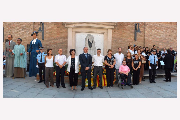 Desenes de persones van assistir a l'acte institucional de celebració de la Diada Nacional de Catalunya, davant el monument de Rafael Casanova, a la plaça 11 de Setembre. Un total de 15 entitats i partits polítics van realitzar ofrenes florals, amenitzades per la Societat Coral El Vallès. En el moment de l'ofrena consistorial, només van comparèixer els regidors de l'equip de govern, ja que l'oposició no voler posar per a la foto oficial, com a mostra de protesta davant el tripartit local.