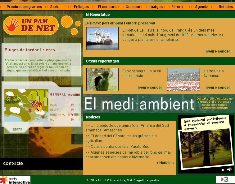 ‘El medi ambient' s'emet de dilluns a divendres a les 14.20 hores per TV3 i TVCi. Tots els reportatges es reemeten de forma conjunta la setmana següent pel Canal 3/24.