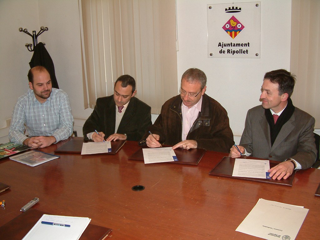 FOTO: D'esquerra a dreta, Ferran Torel, regidor de Comerç; Joan Serrano, president de la Unió de Botiguers; Juan Parralejo, alcalde; Ramon Santos, gerent d'Autocars Font.