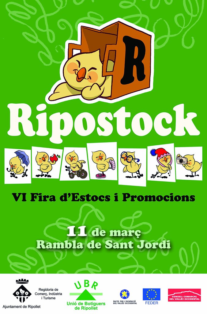 El proper 11 de març tindrà lloc la sisena edició del Ripostock de Ripollet. En aquesta ocasio comptarà amb la participació de 41 comerços de la vila, distribuïts en 56 carpes. Això implica que, respecte l'edició anterior, s'ha duplicat la presència d'estands a la fira d'estocs i promocions. Les botigues i empreses s'instal·laran a la rambla de Sant Jordi, des de la porta del Centre Cultural fins a l'Oficina de l'Inem, on es col·locarà un escenari, on tindran lloc diferents activitat d'animació.