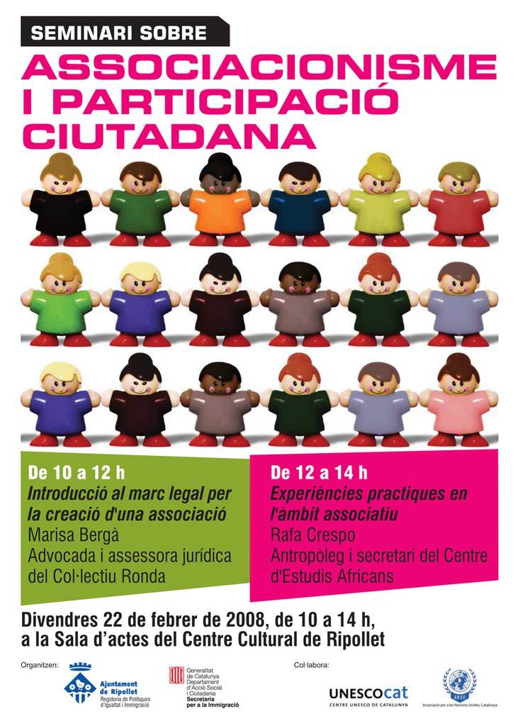 El programa començarà a les deu del matí, amb una xerrada amb el títol Introducció al marc legal per la creació d'una associació, a càrrec de Marisa Bergà, advocada i assessora jurídica del Col·lectiu Ronda. A les dotze del migdia Rafa Crespo, antropòleg i secretari del Centre d'Estudis Africans, realitzarà un col·loqui sobre experiències pràctiques en l'àmbit associatiu. El seminari va adreçat a aquelles persones que estiguin interessades en constituir una associació i a aquelles associacions que ja estiguin constituïdes i vulguin conèixer bones pràctiques en l'àmbit associatiu.