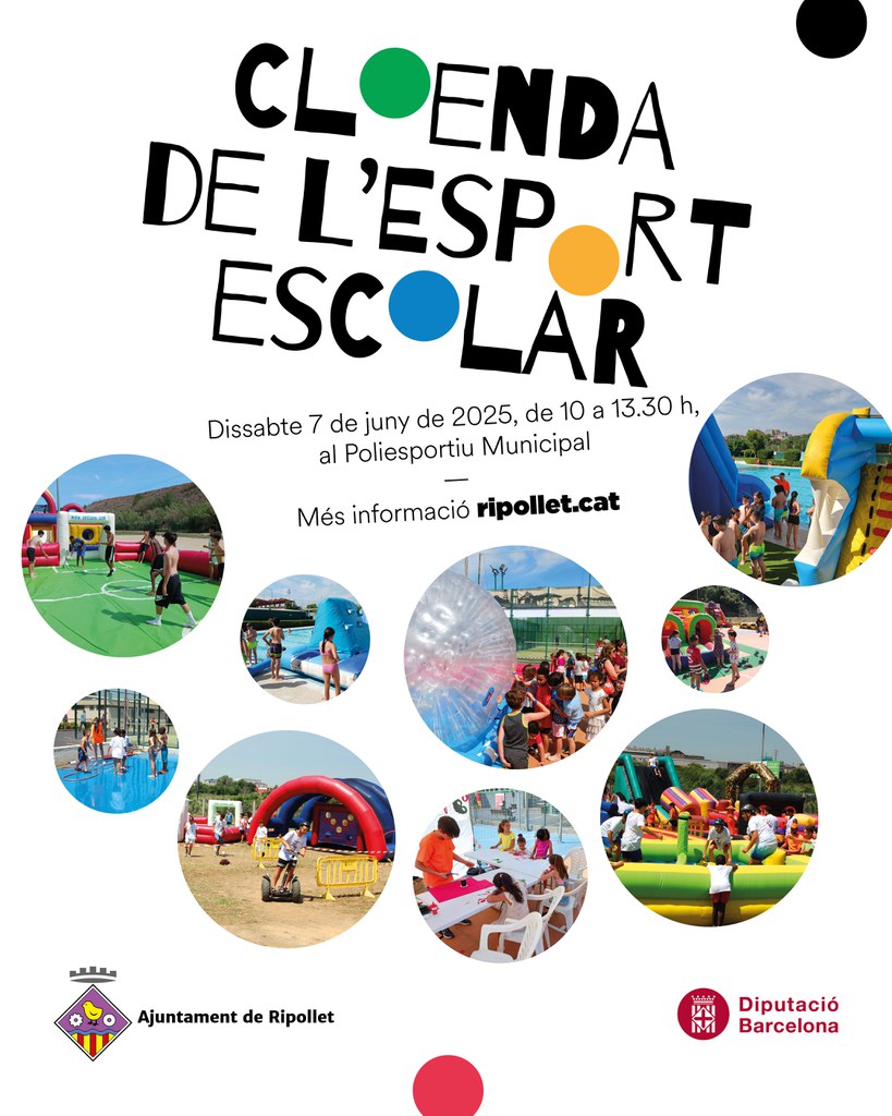 La Festa de cloenda de l'esport escolar té com a objectiu que els nens i nenes participants en l’esport escolar de Ripollet passin un matí divertit amb els seus companys/es i els seus monitors/es, gaudint d’una sèrie d'activitats lúdiques. La durada de la festa serà aproximadament des de les 10 h, fins les 13.30 h.