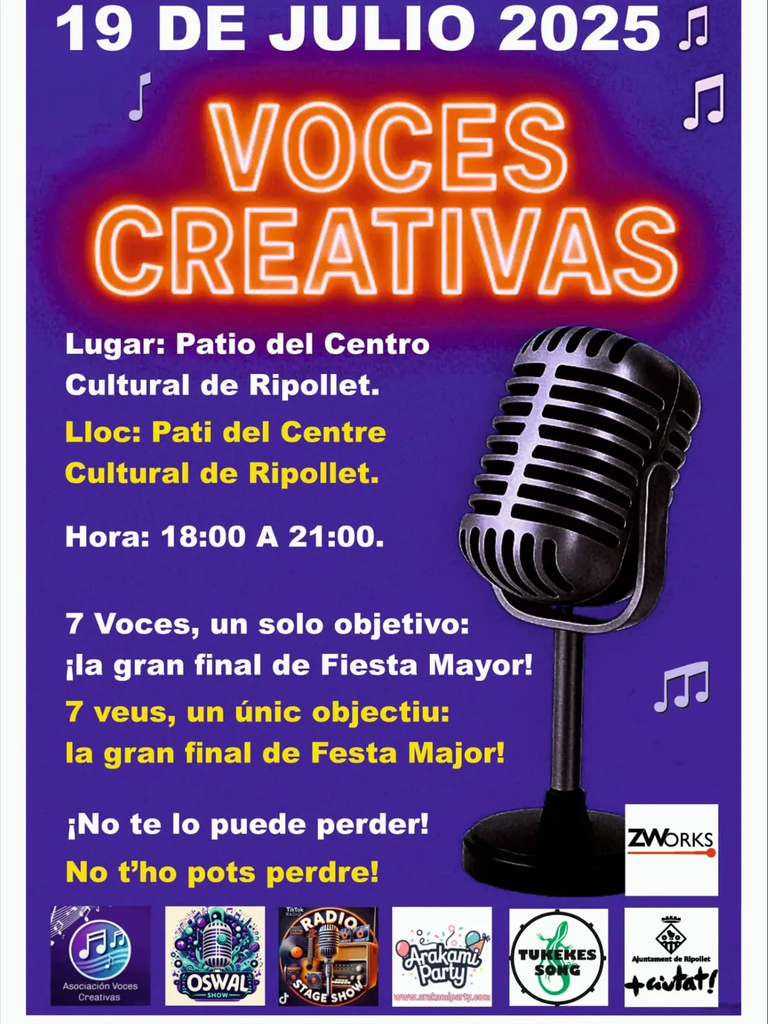Aquest dissabte, 19 de juliol, el Pati del Centre Cultural de Ripollet acollirà, de 18 a 21 h, la darrera semifinal del concurs “Voces Creativas”, una iniciativa que posa en valor el talent musical local i dona oportunitats a nous intèrprets.
