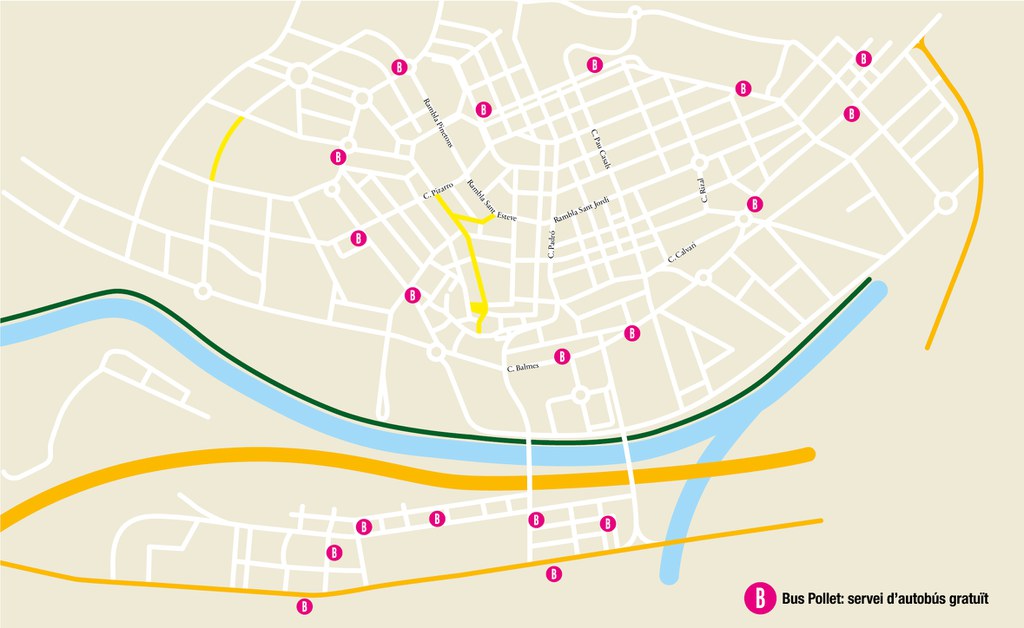 Farà el circuit del transport públic dels festius (València/Sant Jordi – Sant Andreu – Maria Torras – Sant Josep – Molí d’en Rata – Balmes/Lidl i seguirà cap al barri del Pont Vell fins a Verge de Montserrat – Santa Rosa – CAP Farigola – Concòrdia – cruïlla Maranges i de nou cap a Balmes – Sant Jaume – Escola El Martinet i València/Sant Jordi...).