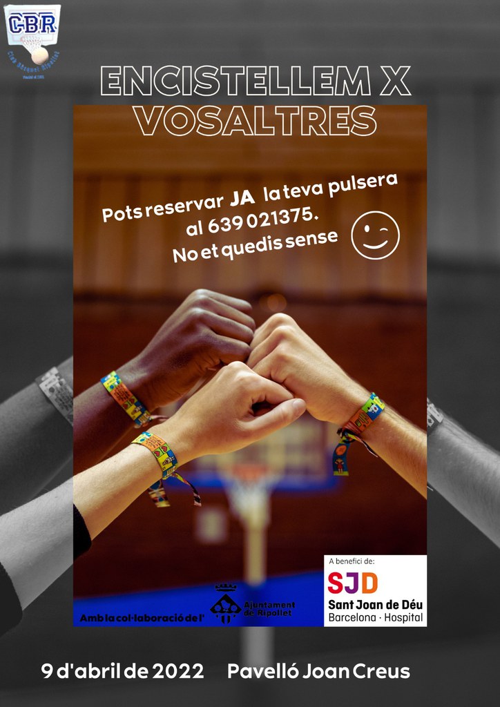 El Club Bàsquet Ripollet organitza aquest dissabte, 9 d'abril, a partir de les 10 del matí la jornada "Encistellem per vosaltres", al Pavelló Municipal Joan Creus. La cita, que compta amb la col·laboració i suport de l'Ajuntament de Ripollet, servirà per recaptar fons per a l'Hospital d'Infants Sant Joan de Déu. Es duran a terme diferents partits de bàsquet durant tot el dia i es podran comprar polseres solidàries a 3 euros.